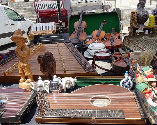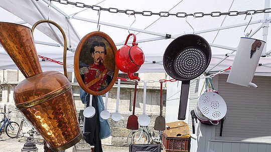 Ob Glas aus den vergangenen drei Jahrhunderten, historisches Spielzeug wie Kaufläden, Schaukelpferde und Puppen, Schilder und Möbel aus den 1950er-Jahren oder erlesene Stücke aus der Biedermeier-Zeit, frühe Medien wie Grammophone, Schallplatten und antiquarische Bücher: Sammler und Liebhaber von Raritäten finden hier Schönes und Seltenes, das sie erfreut, ebenso wie Besucher, denen der Sinn nach alten Uhren und Schmuck steht. Auch Freunde ausgefallener Musikinstrumente kommen auf ihre Kosten. Der Markt wird Ihnen aber ebenso Freude bereiten, wenn Sie ohne ein bestimmtes Ziel einfach nur darüber schlendern und sich umsehen möchten.